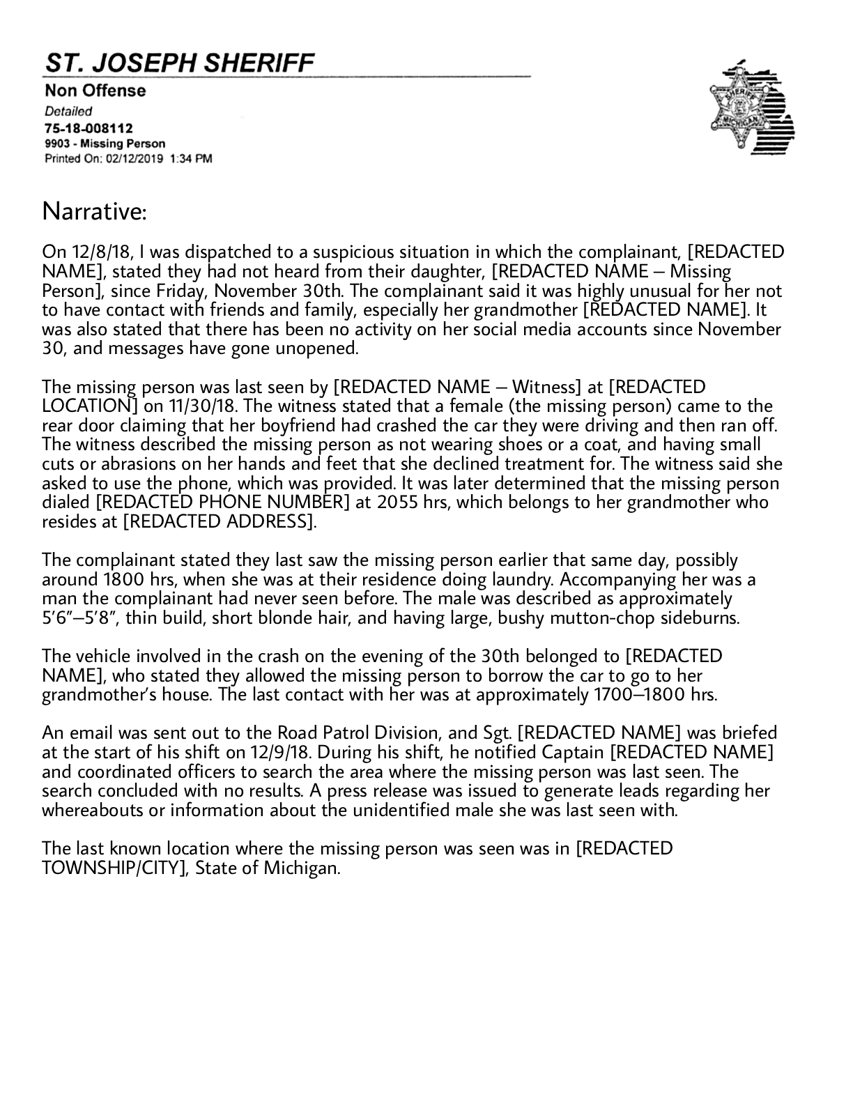 Brittany Wallace-Shank, a 23-year-old woman, disappeared from Sturgis, Michigan, on November 30, 2018. She was last seen leaving her grandmother's home, but the circumstances surrounding her disappearance remain unclear. Her vehicle was found abandoned, leading to concerns about her safety. Brittany went to the home of an elderly man for help, and spoke with a 911 dispatcher, but while the homeowner was still on the phone, Brittany left. She showed up at another home minutes later, where a teenager was inside alone. The teen heard a knock on the front door, while he had eyes on Brittany walking around his house from the back deck. The teen hid out of fear, but locked eyes with Brittany while she was starring in a window. This sighting was the last time anyone would ever see Brittany again.